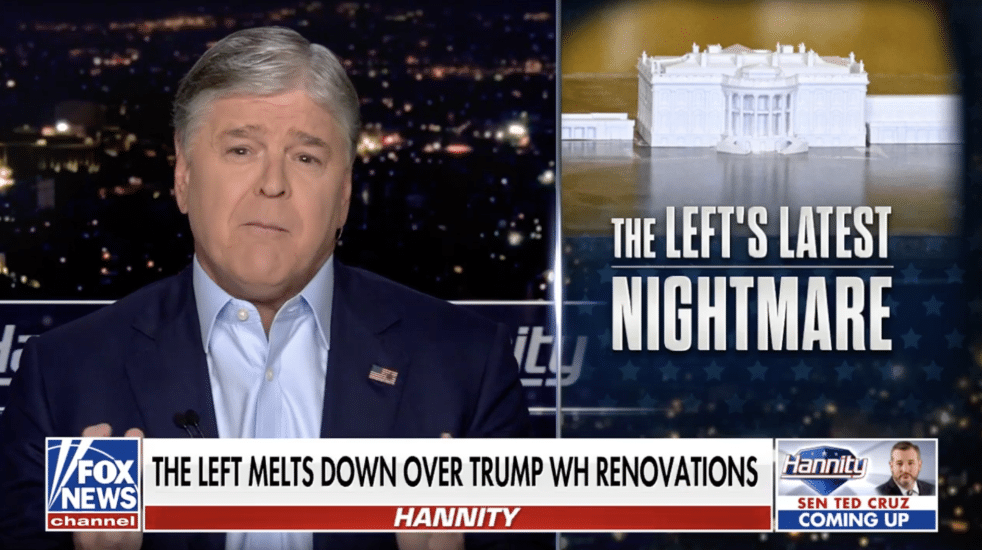 “President after president — they have renovated, they have changed, they have upgraded the White House … [and] the outrage on the left is idiotic,” Hannity said.