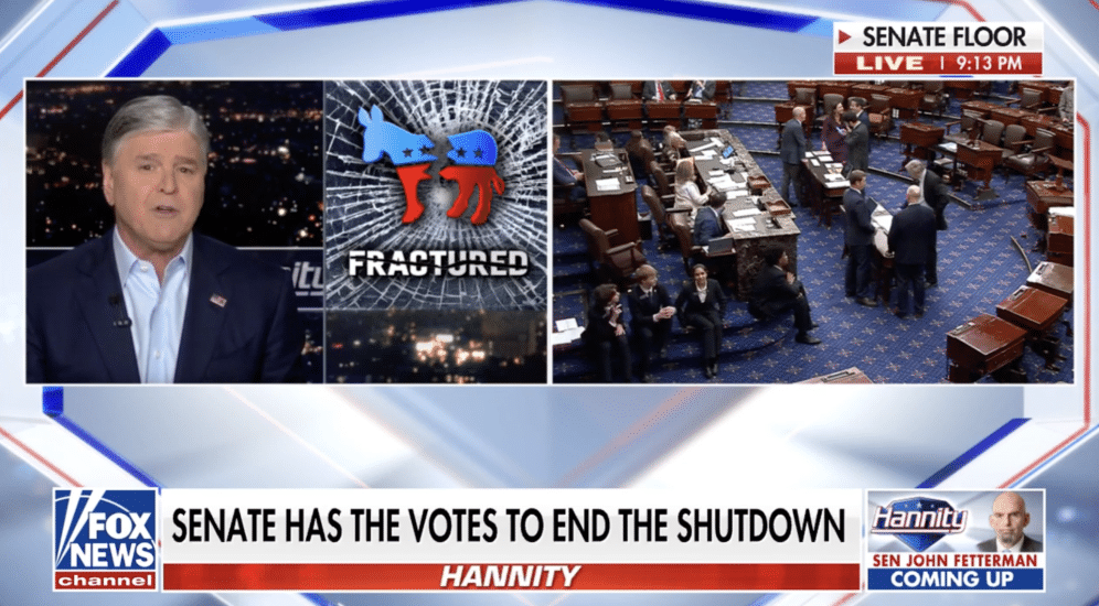 “Humiliation inside the Democratic Party — it’s never been this bad,” Hannity said. “After 40 days and 40 nights of nothing but political grandstanding, a handful of Democrats finally agreed to end their own party’s filibuster.”