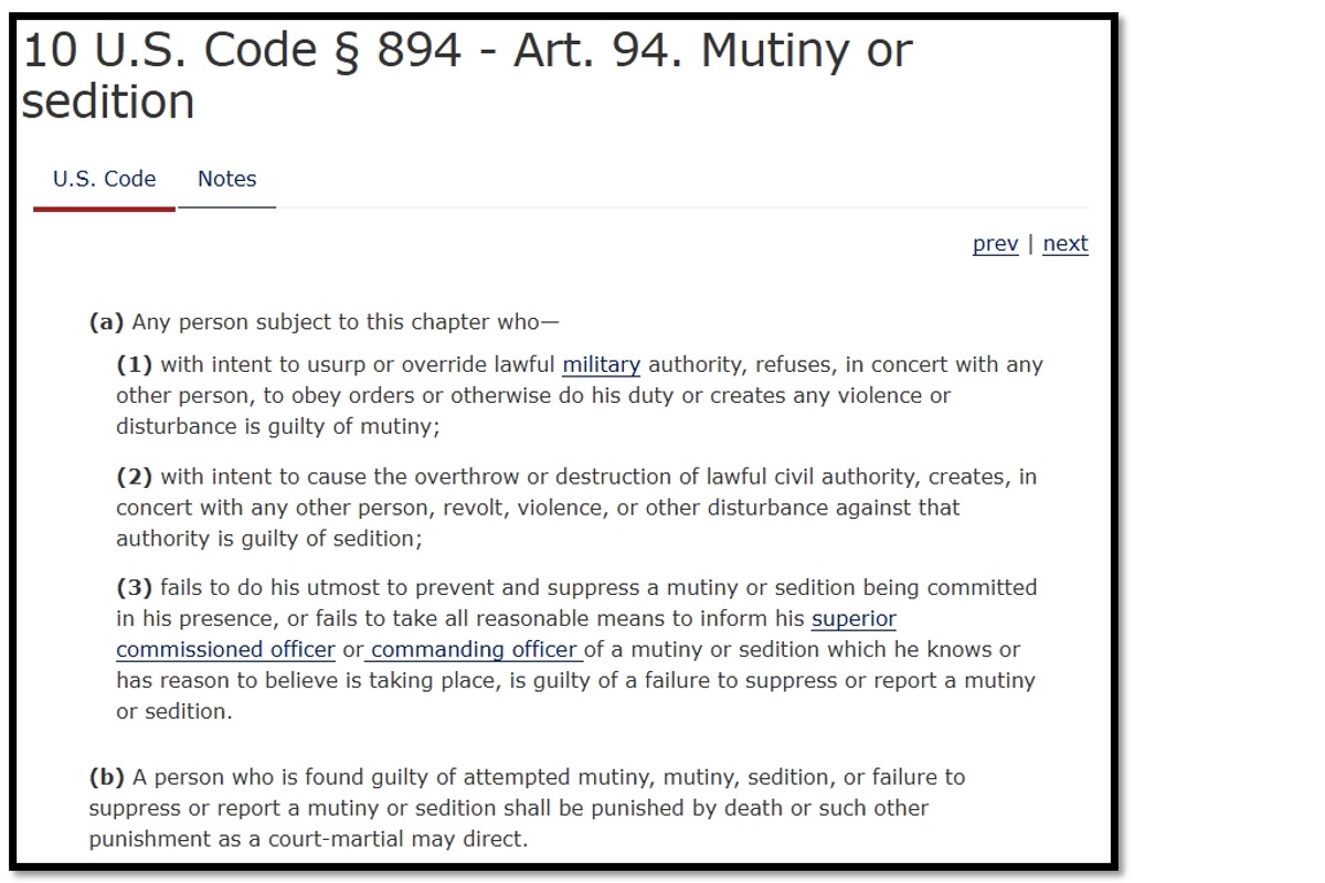 The law also says that any person who “fails to do his utmost to prevent and suppress a mutiny or sedition being committed in his presence, or fails to take all reasonable means to inform his superior commissioned officer or commanding officer of a mutiny or sedition which he knows or has reason to believe is taking place, is guilty of a failure to suppress or report a mutiny or sedition.”
