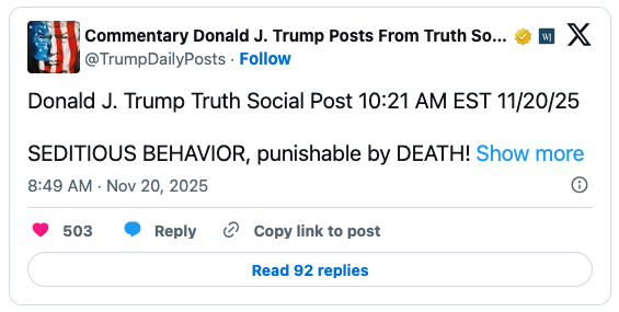 He followed that post with another, again citing sedition. “This is really bad, and Dangerous to our Country,” he wrote: