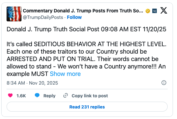 Trump Accuses Six Democrats of Sedition After They Urged Military Members to Disobey “Illegal Orders”