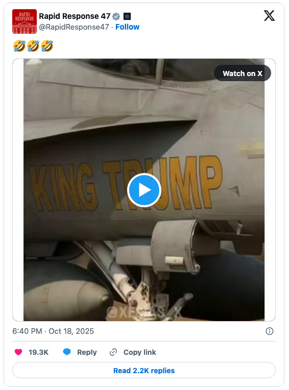 Among prominent right-wing influencers, the tone was the same mix of cruelty and celebration. Benny Johnson, a conservative media personality, applauded the post as “troll[ing] every single ‘NO KINGS’ protester.”