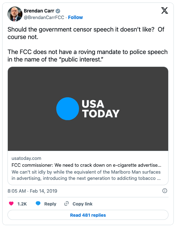 His organization also reminded of Carr’s own past stance that the FCC had no “roving mandate to police speech in the name of ‘public interest.’”