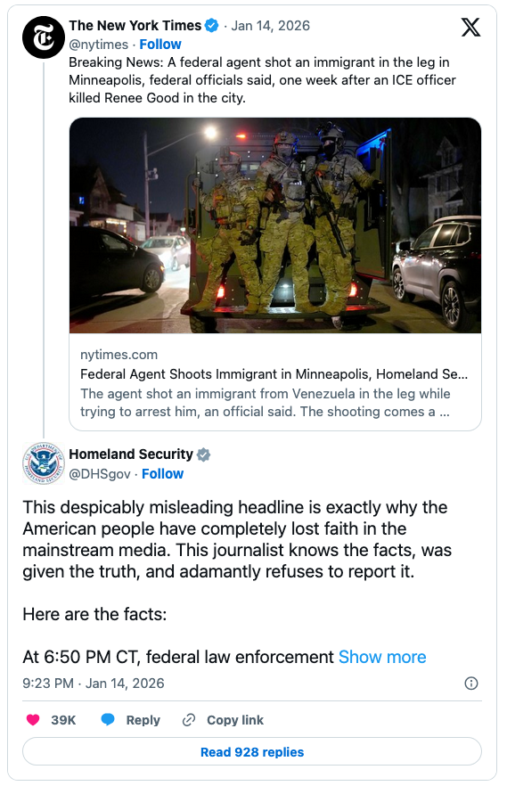 The Times published this “despicably misleading headline,” as DHS called it: “Federal Agent Shoots Immigrant in Minneapolis, Homeland Security Says: The agent shot an immigrant from Venezuela in the leg while trying to arrest him. The shooting comes a week after an ICE agent fatally shot a woman in the city.”
