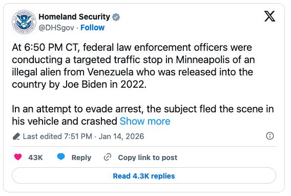 At about 6:50 p.m. Central time on Wednesday, “federal law enforcement officers were conducting a targeted traffic stop in Minneapolis of an illegal alien from Venezuela who was released into the country by Joe Biden in 2022,” DHS reported.