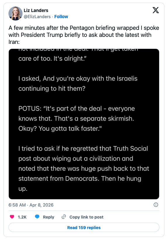 We never made that promise. We never indicated that was going to be the case. What we said is that the ceasefire will be focused on Iran and the ceasefire would be focused on America’s allies, both Israel and the Gulf Arab states. … [I]f Iran wants to let this negotiation fall apart in a conflict where they were getting hammered over Lebanon, which has nothing to do with them, and which the United States never once said was part of the ceasefire, that’s ultimately their choice.