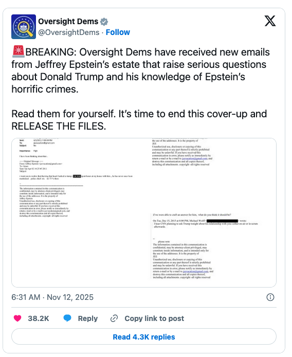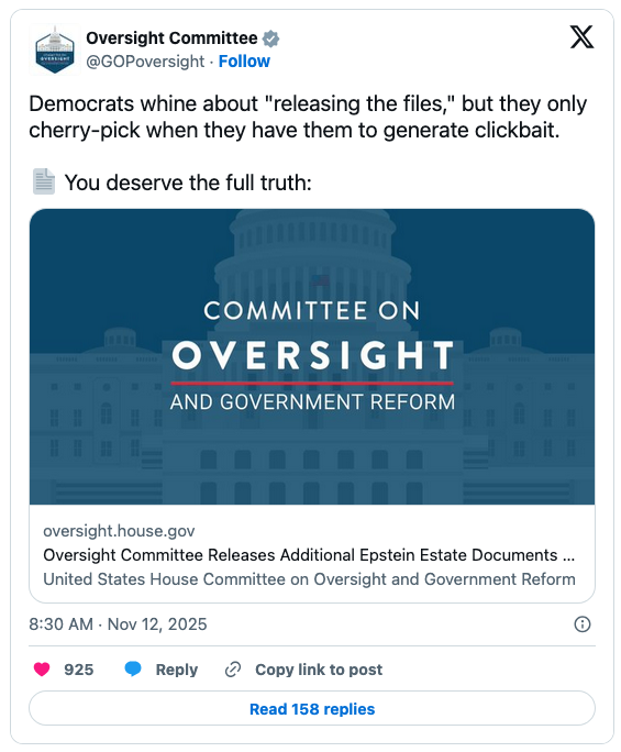 A couple of hours after Democrats released those emails, the House Oversight Committee, chaired by Rep. James Comer (R-Ky.), dumped more than 20,000 Epstein-related pages. “Democrats whine about ‘releasing the files,’ but they only cherry-pick when they have them to generate clickbait. You deserve the truth,” the committee said in an X post that includes a link to the documents they released. Noticeably, the committee didn’t deny the authenticity of the emails pushed out by the Democrats.