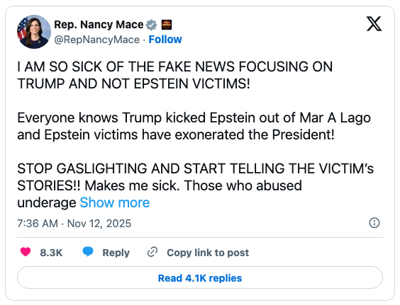 Rep. Nancy Mace of South Carolina, one of the few Republicans who signed the discharge petition, excoriated the Democrats over the emails. “I AM SO SICK OF THE FAKE NEWS FOCUSING ON TRUMP AND NOT EPSTEIN VICTIMS!,” she wrote in a social media post. “Everyone knows Trump kicked Epstein out of Mar A Lago and Epstein victims have exonerated the President!”