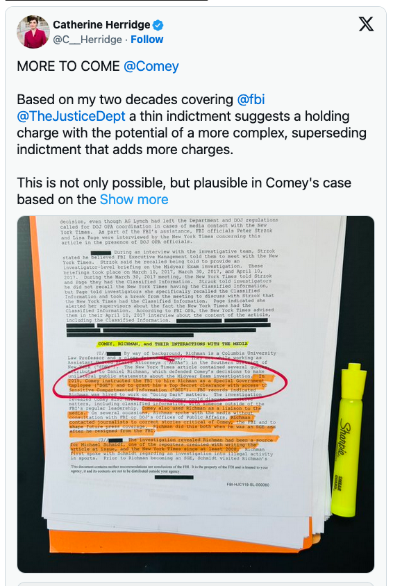 “Based on my two decades covering @fbi @TheJusticeDept a thin indictment suggests a holding charge with the potential of a more complex, superseding indictment that adds more charges,” she wrote on X: