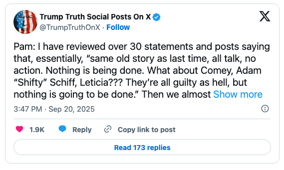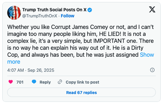 “Whether you like Corrupt James Comey or not, and I can’t imagine too many people liking him, HE LIED!” Trump wrote on X: