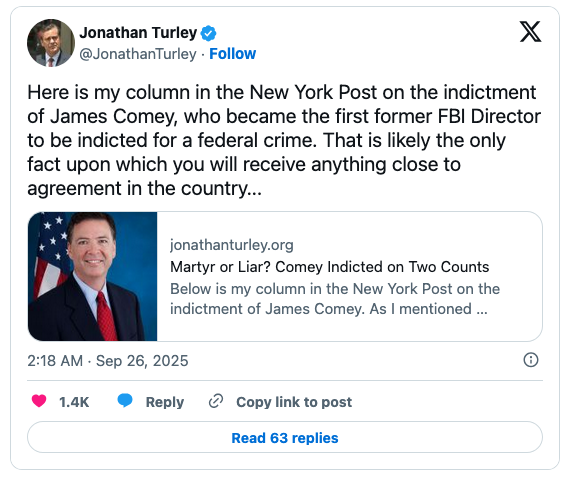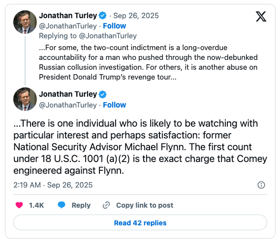 Whatever those details, however, Comey is getting his comeuppance, George Washington University law Professor Jonathan Turley wrote. Comey hit former National Security Advisor and retired General Michael Flynn with the same charges during the first Trump administration, and did so unethically.