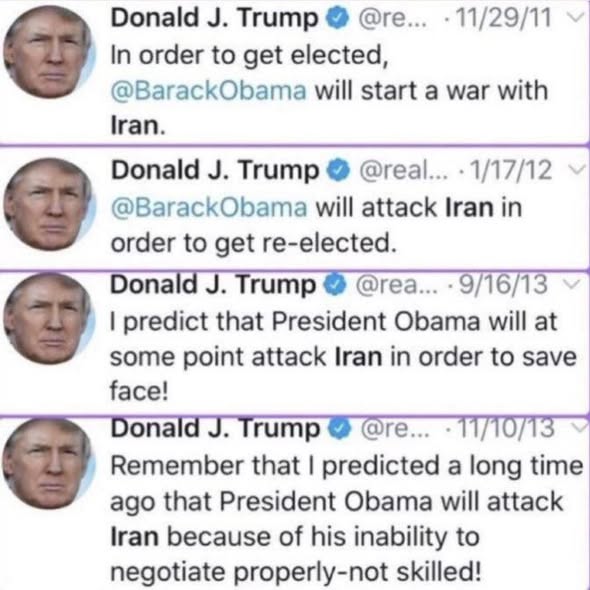 “@BarackObama will attack Iran in order to get re-elected,” he wrote on Twitter on January 17, 2012. On September 16, 2013, Trump wrote that Obama would attack Iran to “save face.”