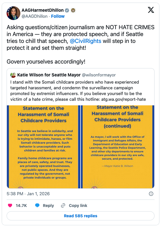 “In Seattle, we believe in solidarity, and our city will not tolerate anyone who is trying to intimidate, harass, or film Somali child care providers,” she wrote:
