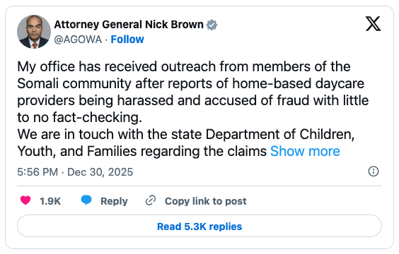 Nick Brown, the state’s top law enforcement official, is apparently worried that those journalists will do for Washington’s Somalis what journalist Nick Shirley did for Minnesota’s: expose them as fraudsters who skin the taxpayers.