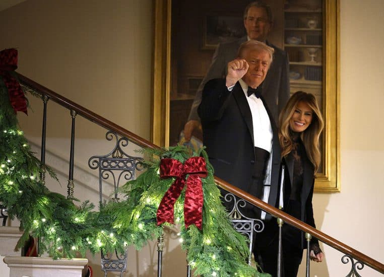 President Donald Trump and First Lady Melania Trump are dressed in black, standing hand in hand before glowing Christmas trees and classic holiday décor inside the White House.