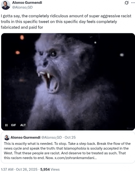 However, the specific nature of Alonso Gurmendi’s rhetoric — accusing Mamdani’s critics of being racist Islamophobes — casts a certain light on his claims that those who disagree with him are “paid for.”