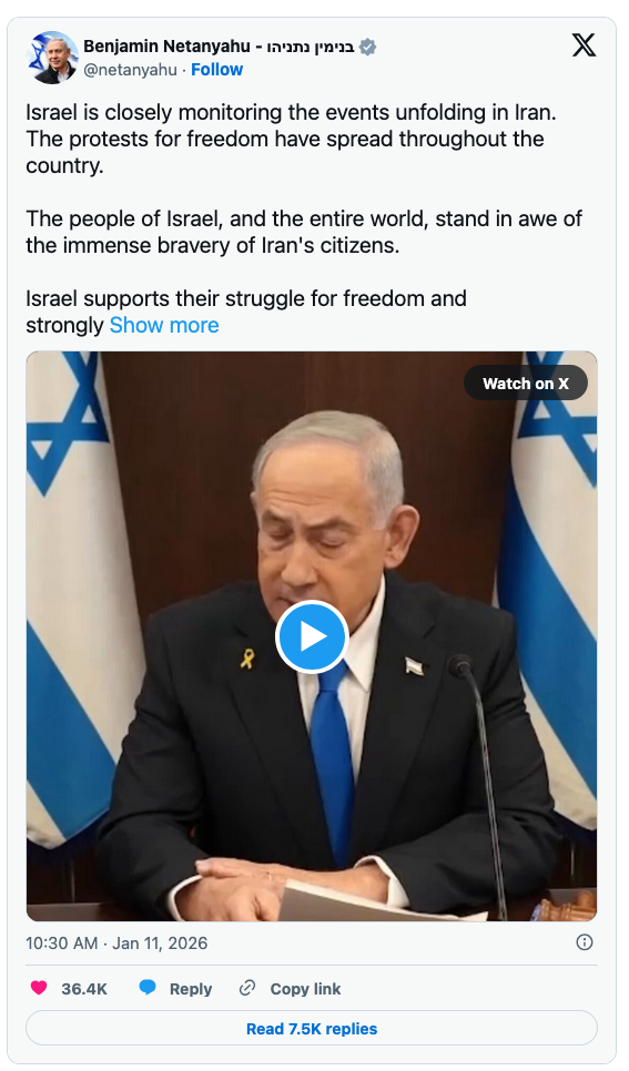 Netanyahu openly called for Iranians to overthrow their government when Israel launched its 12-Day War last summer, telling them in a video to take advantage of the pounding their rulers were taking from Jerusalem and overthrow Khamenei and his cronies.