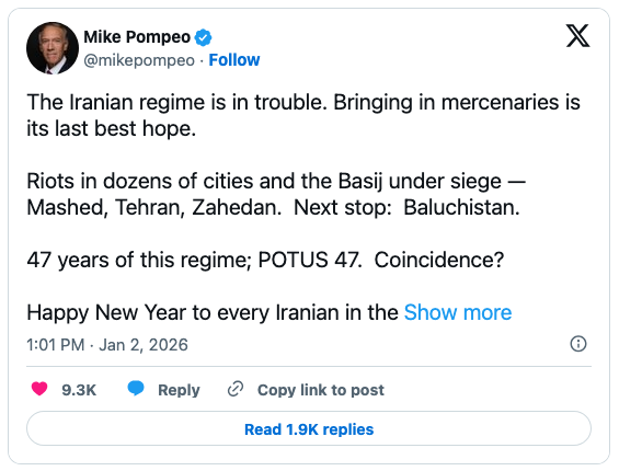 Araghchi also said that former CIA Director and Trump administration Secretary of State Mike Pompeo “admitted that agents of [Israel’s intelligence agency] Mossad were guiding the terrorist movement together with rioters.” He is likely referring to an X post Pompeo published January 2. “Happy New Year to every Iranian in the streets. Also to every Mossad agent walking beside them…,” he wrote.