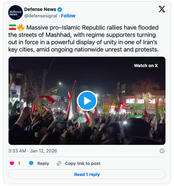 But one component Western media haven’t mentioned, or at least not a lot, is the pro-regime rallies happening in Iran. Former CIA analyst Larry Johnson, who also believes Iran is experiencing a CIA-Mossad color revolution, shared a clip of a pro-Islamic Republic rally in Mashhad.