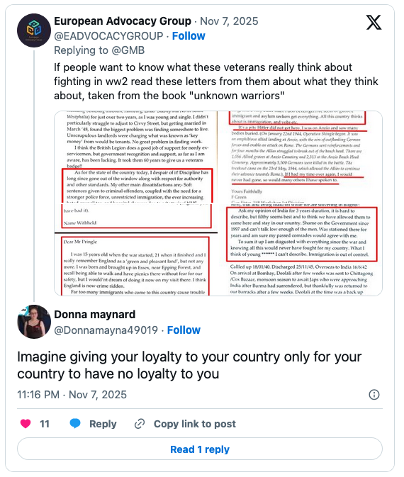 Then, the following X respondent posted (below) what are identified as letters from WWII veterans. The correspondence expresses disenchantment with migration and the state of the culture.