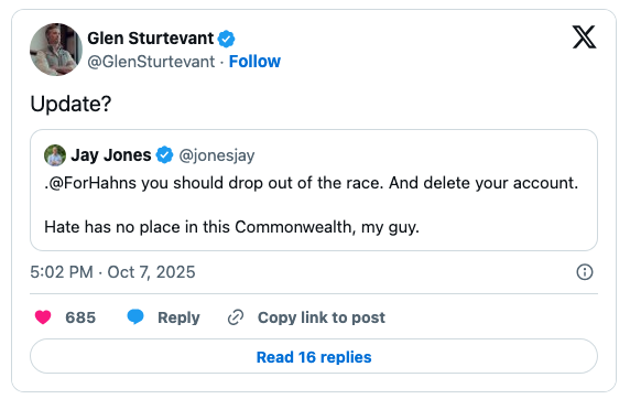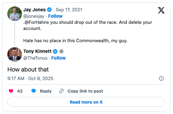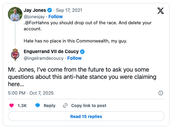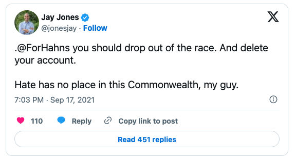 In 2021, Jones demanded on X that Hahns Copeland end his campaign for the House after he posted a comment on X about the size of then-House Speaker Eileen Filler-Corn’s nose.