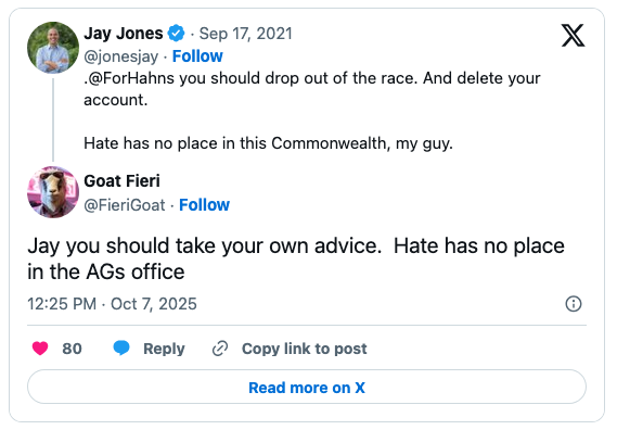Wrote a fourth, “Jay you should take your own advice. Hate has no place in the AGs office.”