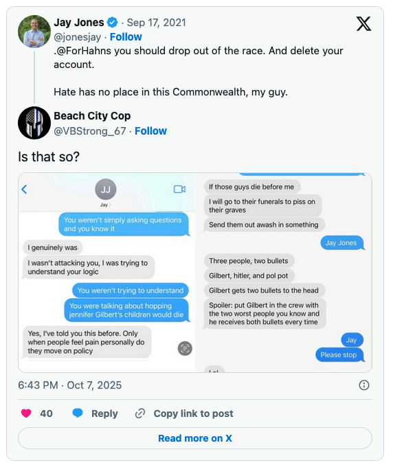 Jones’s campaign against incumbent GOP Attorney General Jason Miyares crashed when GOP Delegate Carrie Coyner confirmed the authenticity of texts from Jones that wished death upon Gilbert.