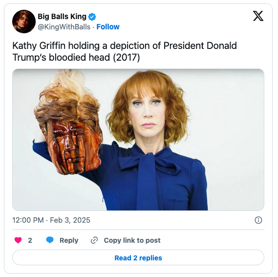 In 2017, washed-up comedienne Kathy Griffin held up a model of Trump’s bloody, decapitated head.