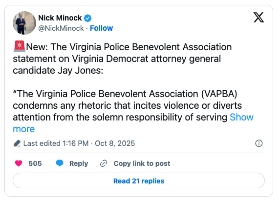 While most Democrats have not called for Jones to drop out of the race, the Virginia Police Benevolent Association (VAPBA), which has endorsed Democratic gubernatorial nominee Abigail Spanberger, said that Jones cannot take office if he defeats Miyares.